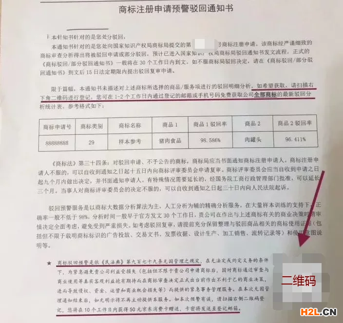 還有所謂的商標(biāo)注冊(cè)申請(qǐng)“駁回預(yù)警”通知書: