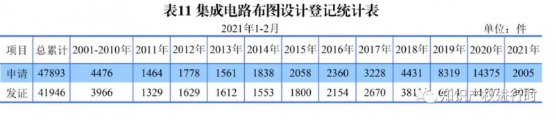 2021年1-2月,集成電路布圖設(shè)計(jì)登記申請(qǐng)2005件, 發(fā)證3077件。