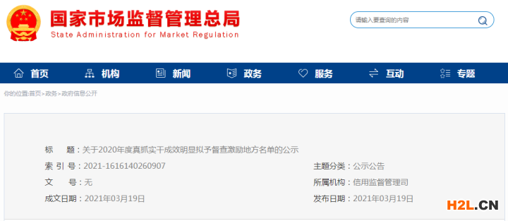 據(jù)市場監(jiān)管總局官網(wǎng)消息,根據(jù)《市場監(jiān)管總局關(guān)于印發(fā)〈市場監(jiān)管工作真抓實(shí)干成效明顯地方督查激勵實(shí)施辦法〉的通知》(國市監(jiān)信發(fā)〔2021〕9 號)的有關(guān)要求,現(xiàn)將2020年度落實(shí)市場監(jiān)管領(lǐng)域有關(guān)重大政策措施真抓實(shí)干成效明顯擬予督查激勵的地方名單予以公示。詳情如下: