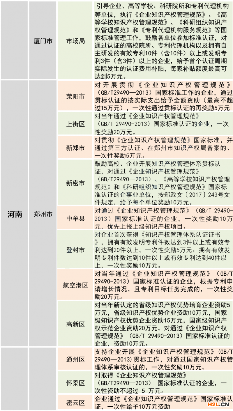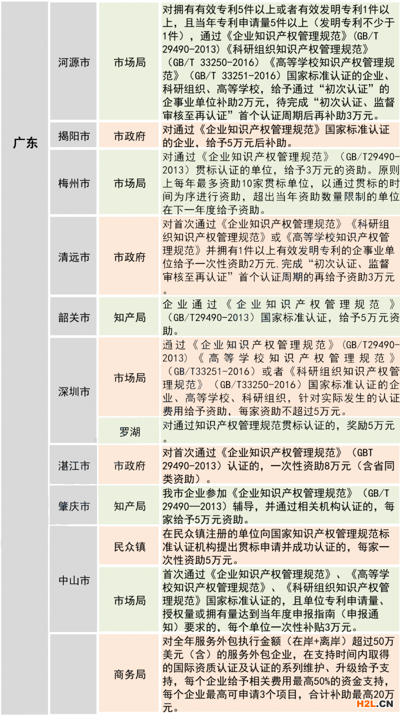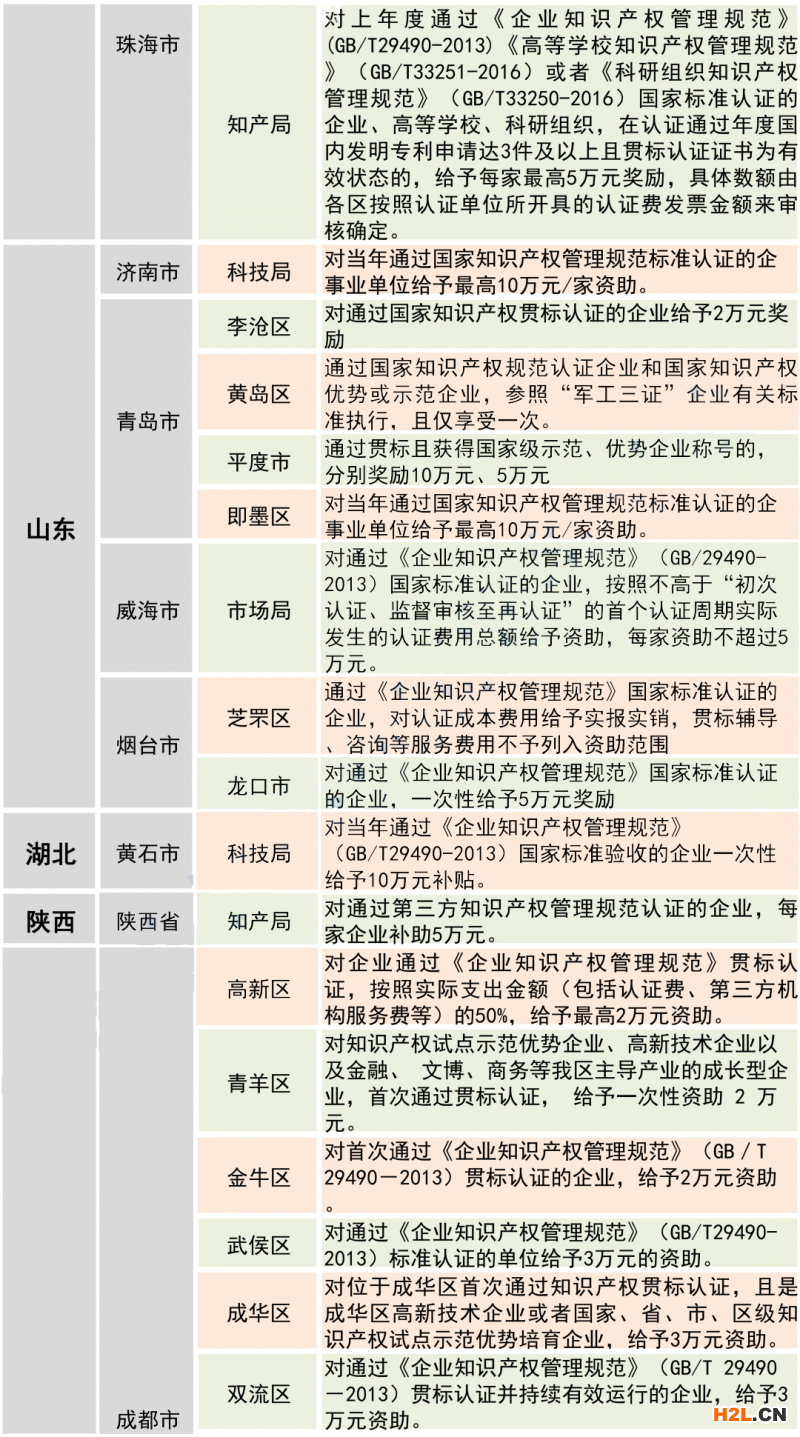 國家知識產(chǎn)權(quán)局發(fā)布了《2019年地方知識產(chǎn)權(quán)戰(zhàn)略暨強(qiáng)國建設(shè)實(shí)施工作要點(diǎn)》的通知,對全國各省市的知識產(chǎn)權(quán)貫標(biāo)工作做了要求,其中關(guān)于山東省是這樣要求的:繼續(xù)推動(dòng)企業(yè)、高校、科研組織、專利代理機(jī)構(gòu)貫標(biāo)工作,年內(nèi)爭取初次認(rèn)證企業(yè)數(shù)量達(dá)到500家。遴選20家高校、20家科研組織及8家專利代理機(jī)構(gòu)進(jìn)行貫標(biāo)試點(diǎn)工作;2019年各個(gè)地市也陸續(xù)出臺了相應(yīng)的補(bǔ)貼政策,例如濟(jì)南市:對當(dāng)年通過國家知識產(chǎn)權(quán)管理規(guī)范標(biāo)準(zhǔn)認(rèn)證的企事業(yè)單位給予最高10萬元/家資助。青島市:對通過《企業(yè)知識產(chǎn)權(quán)管理規(guī)范》國家標(biāo)準(zhǔn)認(rèn)證的企業(yè),按10萬元標(biāo)準(zhǔn)給予后補(bǔ)助。煙臺市芝罘區(qū):對通過《企業(yè)知識產(chǎn)權(quán)管理規(guī)范》標(biāo)準(zhǔn)認(rèn)證的企業(yè),一次性給予10萬元資助。