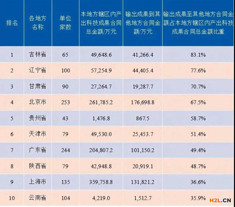 2019年各地方轄區(qū)內(nèi)產(chǎn)出科技成果輸出至其他地方合同金額占合同總金額比重前10名的相關(guān)情況