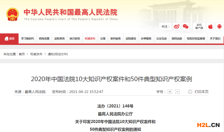 2020年中國法院10大知識產(chǎn)權(quán)案件和50件典型知識產(chǎn)權(quán)案例