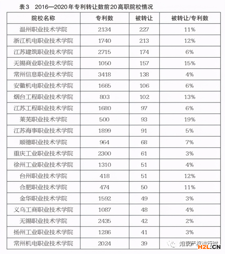 僅兩成的高職院校過(guò)去5年有專利轉(zhuǎn)讓,比例較低。過(guò)去5年,有專利轉(zhuǎn)讓的院校290所,占有專利申請(qǐng)?jiān)盒5?7%,不足全部高職院校的兩成,比例較低,高職院校專利的實(shí)用性有待提升。在專利轉(zhuǎn)讓數(shù)排序前20位的院校中,僅有不到一半的院校轉(zhuǎn)讓率超過(guò)10%。以被轉(zhuǎn)讓數(shù)為序,“十三五”專利轉(zhuǎn)讓數(shù)前20的高職院校情況如表3.