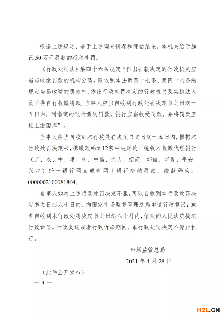 近日,市場監(jiān)管總局根據(jù)《中華人民共和國反壟斷法》第四十八條、四十九條作出行政處罰決定,對騰訊控股有限公司等企業(yè)分別處以50萬元人民幣罰款。