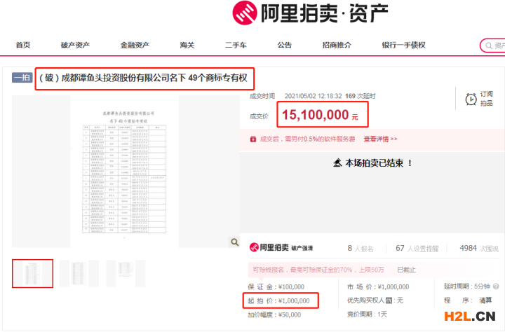 2021年5月1日10時至5月2日10時,成都譚魚頭投資股份有限公司(成都譚魚頭)名下49件商標(biāo)進(jìn)行拍賣,起拍價(jià)為100萬元。