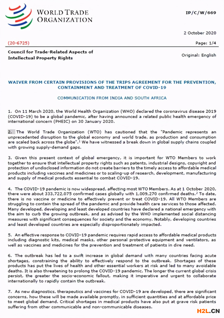 按理說,有了《多哈聲明》,印度和南非面對新冠疫情時,可以采用強制許可條款,直接對防治新冠的疫苗和藥品專利進行強制許可就可以了,根本不需要重新提一個提案。