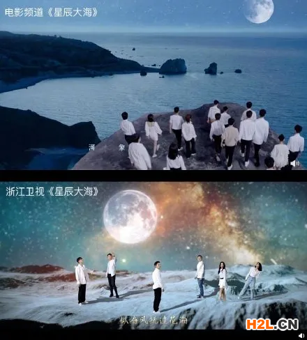 在@中國電影報道 微博中,@中央電影 報道將電影頻道版《星辰大?!稭V與浙江衛(wèi)視版《星辰大海》MV的分鏡進行對比,由對比可看出兩個MV相似度極高。