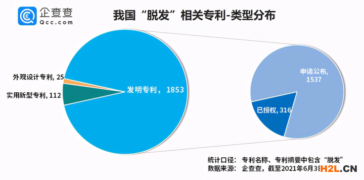 企查查數(shù)據(jù)顯示,從“脫發(fā)”相關(guān)專利的類型來看,發(fā)明專利數(shù)量最多,共1853條,占比93%。其次是實用新型專利,共有112條,最少的是外觀設(shè)計專利,僅有25條。