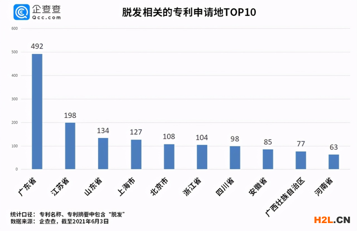 從專利申請人所在地來看,企查查數(shù)據(jù)顯示,廣東數(shù)量最多,占比25%。其次是江蘇、山東、上海、北京、浙江、四川等地,可見脫發(fā)相關(guān)專利申請地大多集中在人口密集、產(chǎn)業(yè)較多的發(fā)達地區(qū)。而之前百度搜索數(shù)據(jù)也發(fā)布了中國脫發(fā)地圖,廣東省在全國脫發(fā)榜單中勇奪第一,其次是江蘇、山東、浙江、北京,可見脫發(fā)嚴重的地區(qū)相應(yīng)的防治專利也較多。