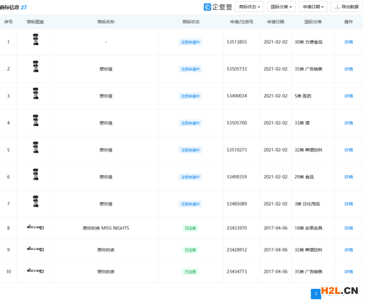 不過,在查詢該公司的商標(biāo)申請情況時,筆者發(fā)現(xiàn),該公司不僅申請了“想你的夜”商標(biāo),還申請了7件“想你液”商標(biāo)。