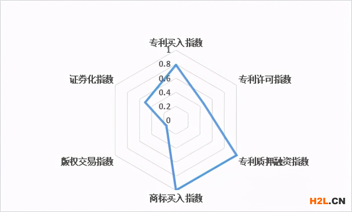 (廣東省各項(xiàng)指標(biāo)均排名全國(guó)前三,其六維數(shù)據(jù)分析圖看上去并不“豐滿”,這與全國(guó)知識(shí)產(chǎn)權(quán)金融化類(lèi)型發(fā)展不平衡以及數(shù)據(jù)的不完全公開(kāi)有關(guān),導(dǎo)致了版權(quán)交易、證券化差異巨大。)
