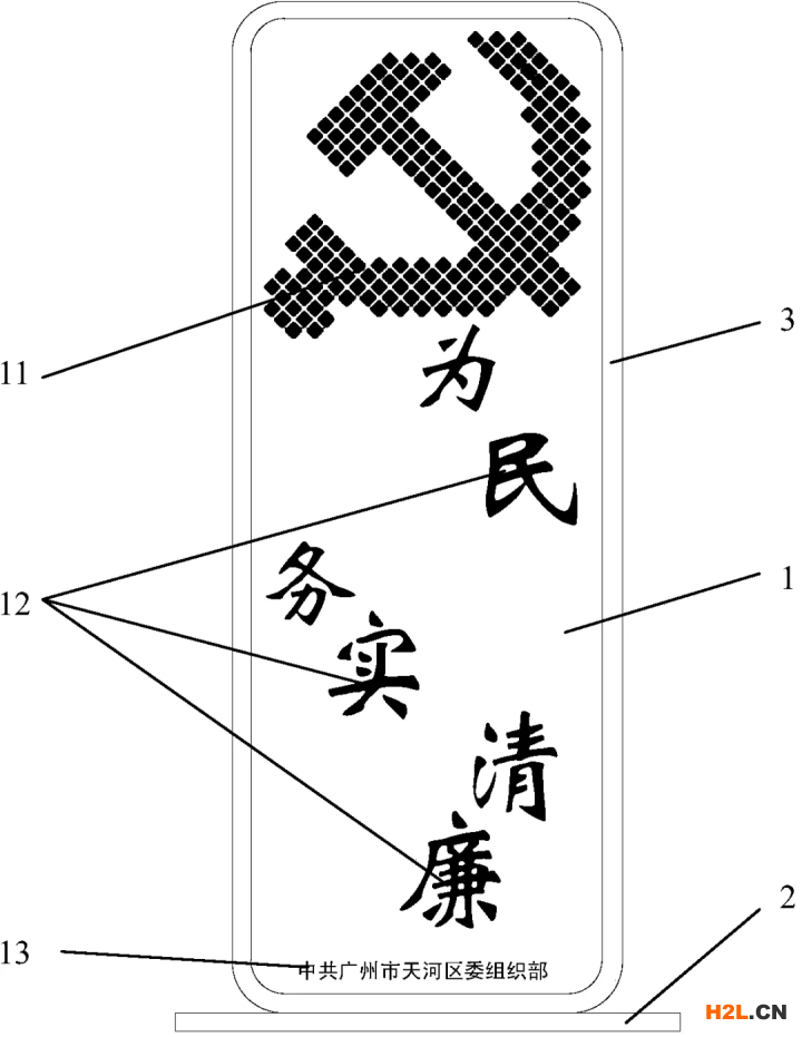 該專利的摘要指出,本實(shí)用新型公開了一種黨徽柱,包括柱子本體和底座,所述柱子本體為扁平的矩形立方體,所述底座為平板,所述柱子本體固定在所述底座上,所述柱子本體的正面開設(shè)有多個(gè)用于收容小黨徽的凹槽,所述小黨徽吸附在所述凹槽中,多個(gè)所述凹槽拼成一個(gè)大黨徽?qǐng)D形。由于柱子本體上的凹槽能夠用于收容黨徽,黨員開展活動(dòng)時(shí)方便黨員從黨徽柱上取下小黨徽佩戴,活動(dòng)結(jié)束后再將小黨徽貼回到黨徽柱上,既起到了宣傳作用,又增加了黨徽的重復(fù)利用率。