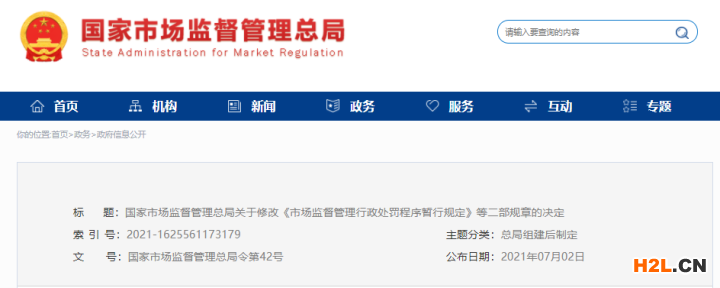 近日,國(guó)家市場(chǎng)監(jiān)督管理總局公布關(guān)于修改《市場(chǎng)監(jiān)督管理行政處罰程序暫行規(guī)定》等二部規(guī)章的決定,修改后的規(guī)章將自2021年7月15日起施行。