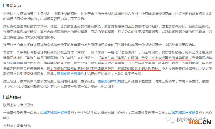 當(dāng)時(shí)一審法院認(rèn)為訴爭(zhēng)商標(biāo)中的“華為”可以起到顯著識(shí)別作用,不易導(dǎo)致消費(fèi)者的混淆誤認(rèn),訴爭(zhēng)商標(biāo)與各引證商標(biāo)分別未構(gòu)成使用在同一種或類似服務(wù)上的近似商標(biāo),判決國家知識(shí)產(chǎn)權(quán)局針對(duì)華為公司就訴爭(zhēng)商標(biāo)所提復(fù)審申請(qǐng)重新作出決定。