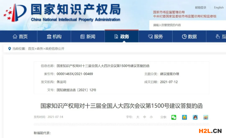 國(guó)家知識(shí)產(chǎn)權(quán)局對(duì)十三屆全國(guó)人大四次會(huì)議第1500號(hào)建議答復(fù)的函