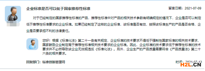 近期,有網友在市場監(jiān)管總局網站公眾留言系統(tǒng)咨詢“企業(yè)標準是否可以低于國家推薦性標準”,市場監(jiān)管總局標準創(chuàng)新管理司給予了答復。