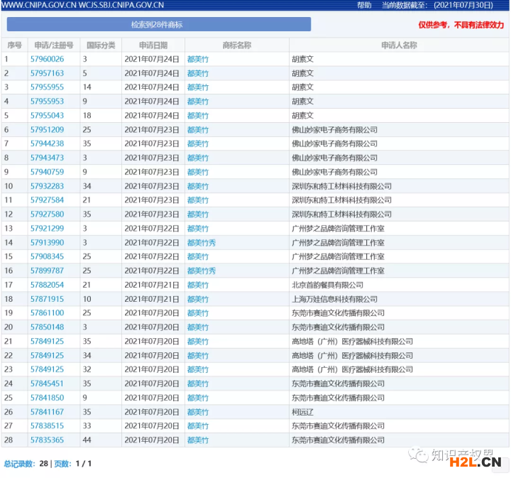 據(jù)中國商標網(wǎng)查詢顯示,截至2021年7月30日,“都美竹”相關商標已被申請了28件,申請人涉及9家公司及個人,最早申請日期為2021年7月20日。