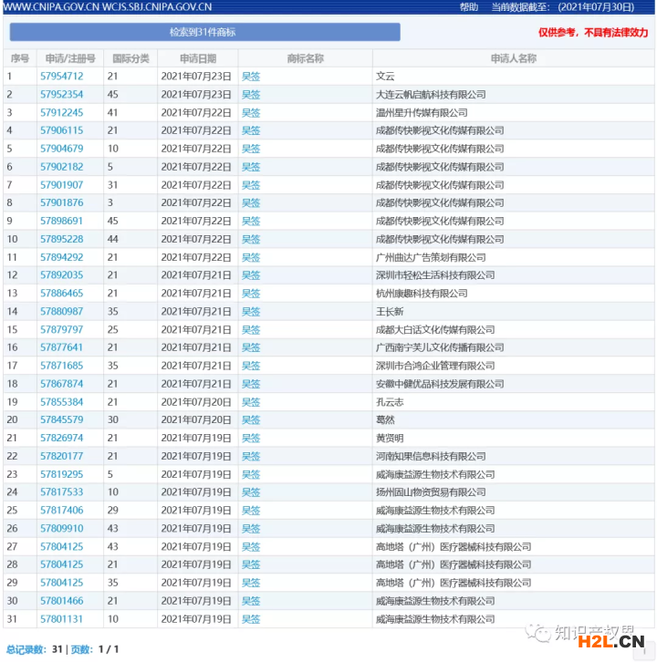 不過,1周前查詢申請“吳簽”商標的數(shù)量為9個,一周之后已經翻倍增長了。