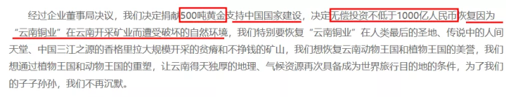 在天價收購商標一事引發(fā)輿論之后,中國云銅于2020年6月2日發(fā)布了《董事局關(guān)于云銅品牌新聞事件的公告》。在公告中,中國云銅表示將“捐獻500噸黃金支持中國國家建設(shè),決定無償投資不低于1000億人民幣恢復因為‘云南銅業(yè)’在云南開采礦業(yè)而遭受破壞的自然環(huán)境”。(最新!中國云銅稱將無償捐贈“云銅”商標,以及500噸黃金、1000億人民幣投資)