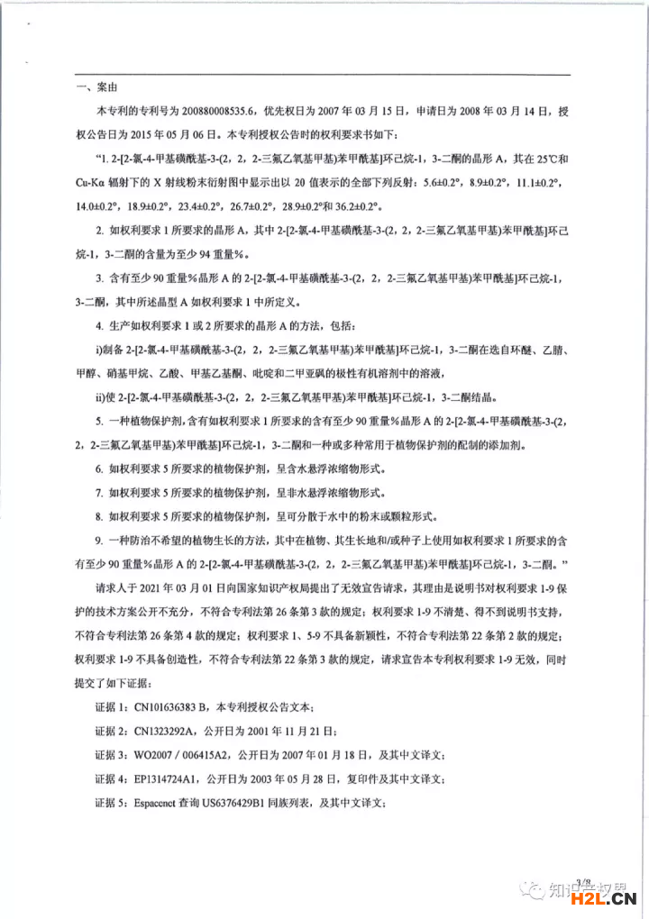 2021年8月23日,國(guó)家知識(shí)產(chǎn)權(quán)局發(fā)文并公告第51413號(hào)無(wú)效宣告請(qǐng)求審查決定書(shū)。據(jù)該決定書(shū)內(nèi)容顯示,江西天宇化工有限公司成功無(wú)效掉巴斯夫歐洲公司的一件除草劑專(zhuān)利,專(zhuān)利號(hào)為ZL200880008535.6.發(fā)明名稱(chēng)為“2-[2-氯-4-甲基磺?;?3-(2.2.2-三氟乙氧基甲基)苯甲酰基]環(huán)己烷-1.3-二酮的晶形”。本文就案件相關(guān)內(nèi)容進(jìn)行解讀。