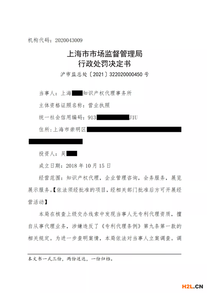 核心提示:近日,上海市市場(chǎng)監(jiān)督管理局網(wǎng)站發(fā)布一則行政處罰信息。經(jīng)查,2018年10月至2020年8月期間,上海某知識(shí)產(chǎn)權(quán)代理事務(wù)所在未取得專(zhuān)利代理機(jī)構(gòu)