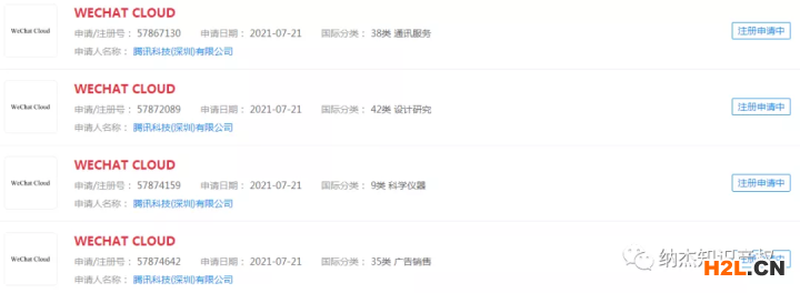據(jù)企查查顯示,騰訊科技(深圳)有限公司早已在今年7月份就申請(qǐng)注冊(cè)了4件“WECHAT CLOUD”商標(biāo),分類(lèi)涉及通訊服務(wù)、設(shè)計(jì)研究、科學(xué)儀器、廣告銷(xiāo)售,目前商標(biāo)狀態(tài)處于等待實(shí)質(zhì)審查階段。