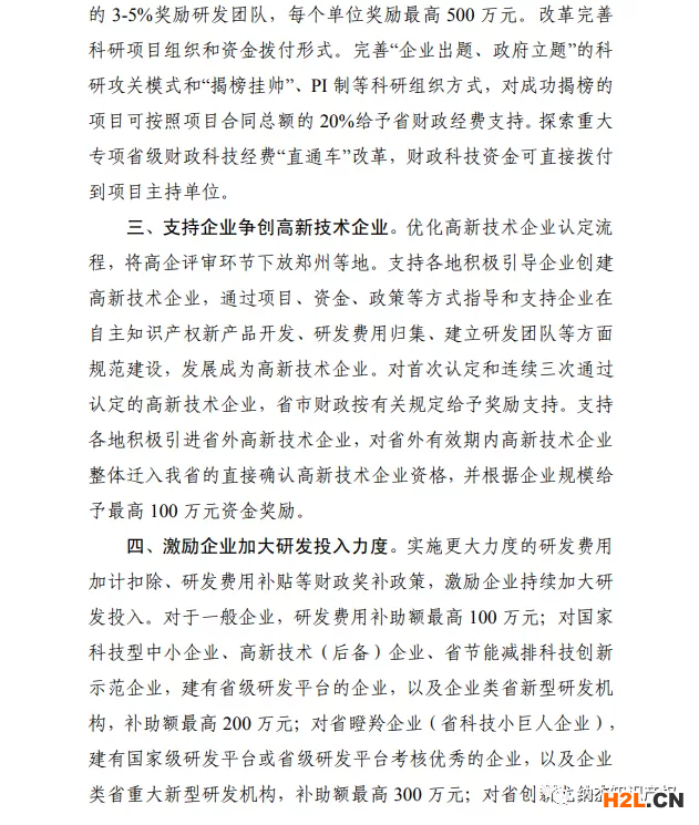 支持企業(yè)爭創(chuàng)高新技術(shù)企業(yè)。優(yōu)化高新技術(shù)企業(yè)認(rèn)定流程,將高企評審環(huán)節(jié)下放鄭州等地。支持各地積極引導(dǎo)企業(yè)創(chuàng)建高新技術(shù)企業(yè),通過項目、資金、政策等方式指導(dǎo)和支持企業(yè)在自主知識產(chǎn)權(quán)新產(chǎn)品開發(fā)、研發(fā)費(fèi)用歸集、建立研發(fā)團(tuán)隊等方面規(guī)范建設(shè),發(fā)展成為高新技術(shù)企業(yè)。對首次認(rèn)定和連續(xù)三次通過認(rèn)定的高新技術(shù)企業(yè),省市財政按有關(guān)規(guī)定給予獎勵支持。支持各地積極引進(jìn)省外高新技術(shù)企業(yè),對省外有效期內(nèi)高新技術(shù)企業(yè)整體遷入我省的直接確認(rèn)高新技術(shù)企業(yè)資格,并根據(jù)企業(yè)規(guī)模給予最高100萬元資金獎勵。