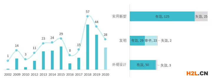 數(shù)據(jù)顯示,截至2021年8月28日鴻星爾克共申請專利257件。2010年至2015年間,鴻星爾克專利申請量持續(xù)增加,2016年專利申請量下降后,次年回升并持續(xù)增長,到2018年達到申請高峰,共申請了57項專利。整體來看,鴻星爾克專利申請量呈上升趨勢,說明鴻星爾克注重新產(chǎn)品的研發(fā),對于新產(chǎn)品的知識產(chǎn)權保護力度持續(xù)增加。各種類型的專利中失效專利數(shù)量占比較低,說明專利有效性維持比較好。