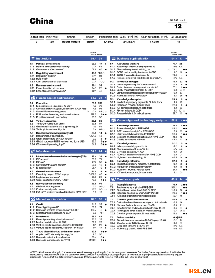 ▲ 中國2021年全球創(chuàng)新指數(shù)各項指標詳細情況(來源:WIPO)