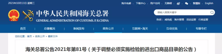 海關總署公告2021年第81號(關于調整必須實施檢驗的進出口商品目錄的公告)