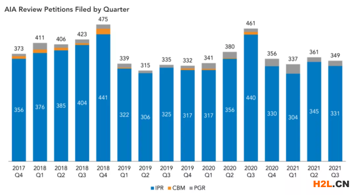 (4)美國審判與上訴委員會(huì)(PTAB)發(fā)起《美國發(fā)明法》(AIA)復(fù)審率下降。2021年第三季度,PTAB受理了349件復(fù)審審查申請(qǐng),其中,331件雙方復(fù)審(IPR)申請(qǐng)和18件授權(quán)后審查(PGR)申請(qǐng)。目前,PTAB的復(fù)審率57.2%,比2020年的58.1%略低,比2019年的61%下降更明顯。