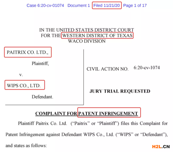 兩起專利侵權(quán)訴訟的受理法院都是:THE UNITED STATES DISTRICT COURT FOR THE WESTERN DISTRICT OF TEXAS WACO DIVISION(美國法院德克薩斯州西部地區(qū)的韋科分部),專利訴訟優(yōu)選地之一。