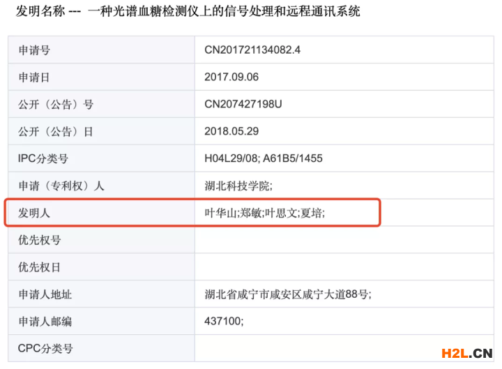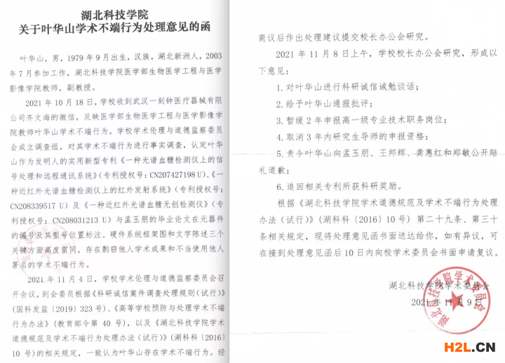 11月9日,湖北科技學(xué)院學(xué)術(shù)委員會(huì)在內(nèi)部公布了《湖北科技學(xué)院關(guān)于葉華山學(xué)術(shù)不端行為處理意見(jiàn)的函》,其中顯示:學(xué)校學(xué)術(shù)倫理與道德監(jiān)察委員會(huì)成立調(diào)查組,對(duì)葉華山學(xué)術(shù)不端行為進(jìn)行事實(shí)調(diào)查,認(rèn)定葉華山作為發(fā)明人的實(shí)用新型專利《一種光譜血糖檢測(cè)儀上的信號(hào)處理和遠(yuǎn)程通訊系統(tǒng)》(專利授權(quán)號(hào):CN207427198U)、《一種近紅外光譜血糖檢測(cè)儀上的紅外發(fā)射系統(tǒng)》(專利授權(quán)號(hào):CN208339517U)及《一種近紅外光譜血糖無(wú)創(chuàng)檢測(cè)儀》(專利授權(quán)號(hào):CN208031213U)與孟玉朋的畢業(yè)論文在元器件的編號(hào)及其型號(hào)位置標(biāo)注、硬件系統(tǒng)框架圖和文字陳述三個(gè)關(guān)鍵方面高度雷同,存在剽竊他人學(xué)術(shù)成果和不當(dāng)使用他人署名的學(xué)術(shù)不端行為。