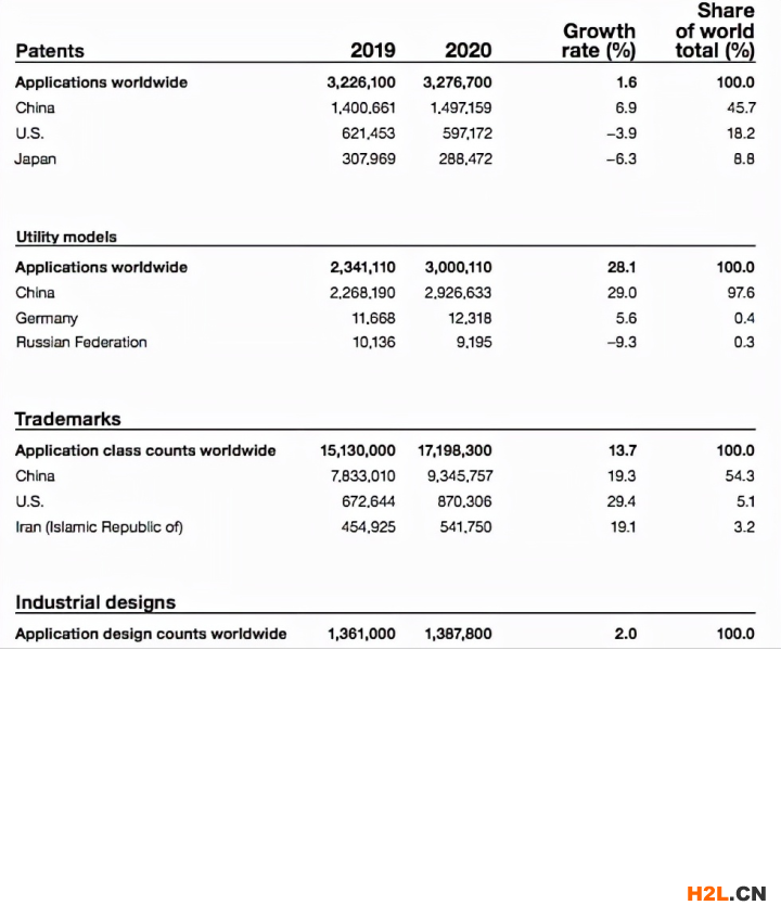 2020年,全世界發(fā)明專利申請共327.6萬件,中國申請了149.7萬件,占比為45.7%;實(shí)用新型共申請了300萬件,中國申請了290.6萬件,占比達(dá)到97.6%,也就是說全世界的實(shí)用新型專利幾乎都是中國申請的。