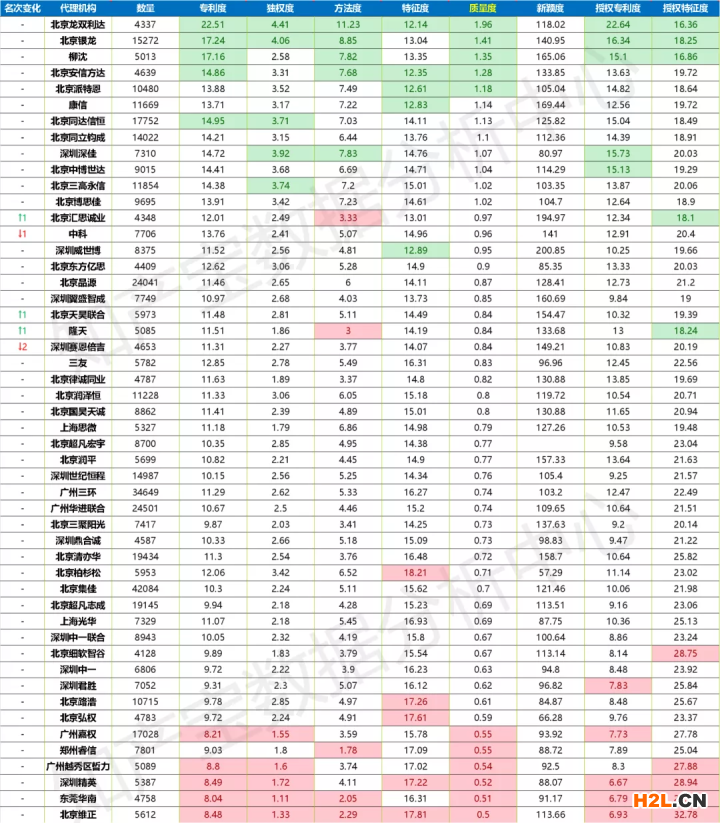 2、對上述入圍代理機構根據(jù)特征度專利度,獨權度,方法度復合形成的質(zhì)量度指標進行數(shù)據(jù)分析,并篩選質(zhì)量度排名前50位的代理機構。