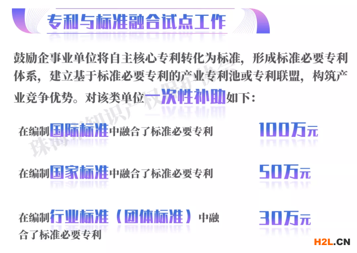 (四)支持開展專利與標(biāo)準(zhǔn)融合試點(diǎn)工作。鼓勵(lì)企事業(yè)單位將自主核心專利轉(zhuǎn)化為標(biāo)準(zhǔn),形成標(biāo)準(zhǔn)必要專利體系,建立基于標(biāo)準(zhǔn)必要專利的產(chǎn)業(yè)專利池或?qū)@?lián)盟,構(gòu)筑產(chǎn)業(yè)競(jìng)爭(zhēng)優(yōu)勢(shì)。對(duì)于在編制國(guó)際標(biāo)準(zhǔn)、國(guó)家標(biāo)準(zhǔn)、行業(yè)標(biāo)準(zhǔn)(團(tuán)體標(biāo)準(zhǔn))中融合了標(biāo)準(zhǔn)必要專利的單位,分別一次性資助100萬(wàn)、50萬(wàn)、30萬(wàn)。
