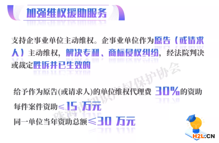 (十四)加強(qiáng)維權(quán)援助服務(wù),支持企事業(yè)單位主動(dòng)維權(quán)。企事業(yè)單位作為原告(或請(qǐng)求人)主動(dòng)維權(quán),解決專利、商標(biāo)侵權(quán)糾紛,經(jīng)法院判決或裁定勝訴并已生效的,給予作為原告(或請(qǐng)求人)的單位維權(quán)代理費(fèi)30%的資助,每件案件最高資助15萬(wàn)元,同一單位當(dāng)年資助總額不超過30萬(wàn)元。