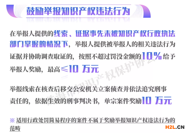 (十七)鼓勵(lì)舉報(bào)知識(shí)產(chǎn)權(quán)違法行為。在舉報(bào)人提供的線索、證據(jù)事先未被知識(shí)產(chǎn)權(quán)行政執(zhí)法部門掌握的情況下,舉報(bào)人提供被舉報(bào)人的相關(guān)違法行為證據(jù)并協(xié)助調(diào)查取證的,按照不超過罰沒金額的10%給予舉報(bào)人獎(jiǎng)勵(lì),最高不超過10萬(wàn)元。