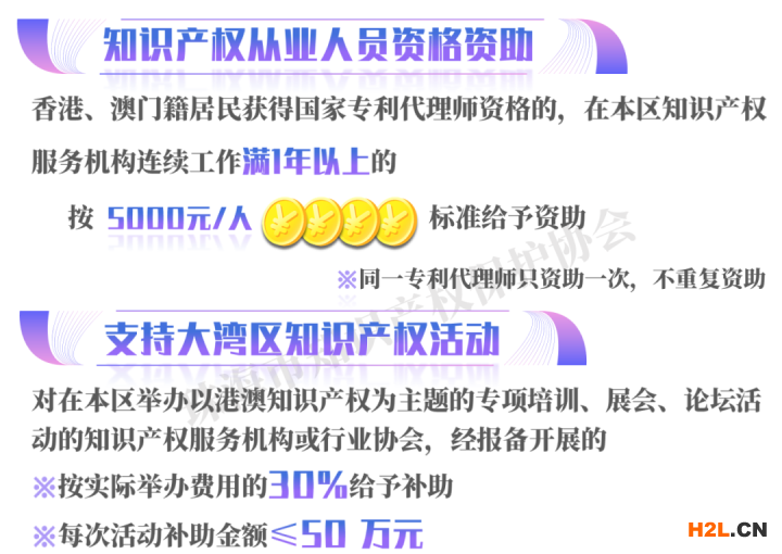 (十八)知識(shí)產(chǎn)權(quán)從業(yè)人員資格資助。香港、澳門籍居民獲得國(guó)家專利代理師資格的,在本區(qū)知識(shí)產(chǎn)權(quán)服務(wù)機(jī)構(gòu)連續(xù)工作滿1年以上的,按5000元/人標(biāo)準(zhǔn)給予資助。同一專利代理師只資助一次,不重復(fù)資助。