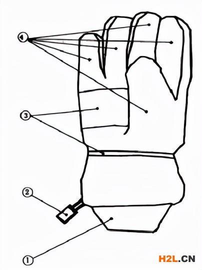 一種自動(dòng)恒溫的電動(dòng)車發(fā)熱手套,用一雙和平常一樣的保溫手套,手套的手背、手心及手指的夾層里放入用雙層加長手指無紡布做基布,中間夾有遠(yuǎn)紅外炭纖維發(fā)熱絲的發(fā)熱片(如圖2所示),發(fā)熱片上的手指發(fā)熱絲(7)對(duì)號(hào)入座,把發(fā)熱絲引線插座(2)放在手套的套口外面。在手套內(nèi)膽的手背中間裝有一個(gè)溫控開關(guān)(9),溫控開關(guān)(9)的引線是串聯(lián)椄在炭纖維發(fā)熱絲上的,當(dāng)溫度超于溫控開關(guān)(9)控制的溫度時(shí),溫控開關(guān)(9)就會(huì)自動(dòng)切斷加溫電源,溫度不再上升,當(dāng)手套溫度低于溫控開關(guān)(9)選擇的溫度時(shí),溫控開關(guān)(9)就會(huì)自動(dòng)接通加熱電源,再次加溫。