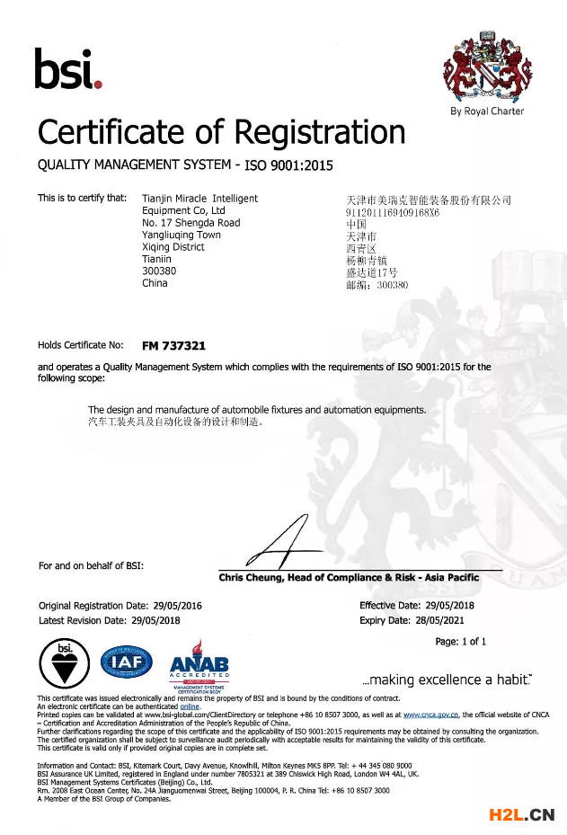 例如:組織名稱為天津市美瑞克智能裝備股份有限公司,證書編號(hào)為 FM737321.認(rèn)證依據(jù)為 ISO9001:2015 的質(zhì)量管理體系認(rèn)證證書經(jīng) BSI 核實(shí)是偽造的。