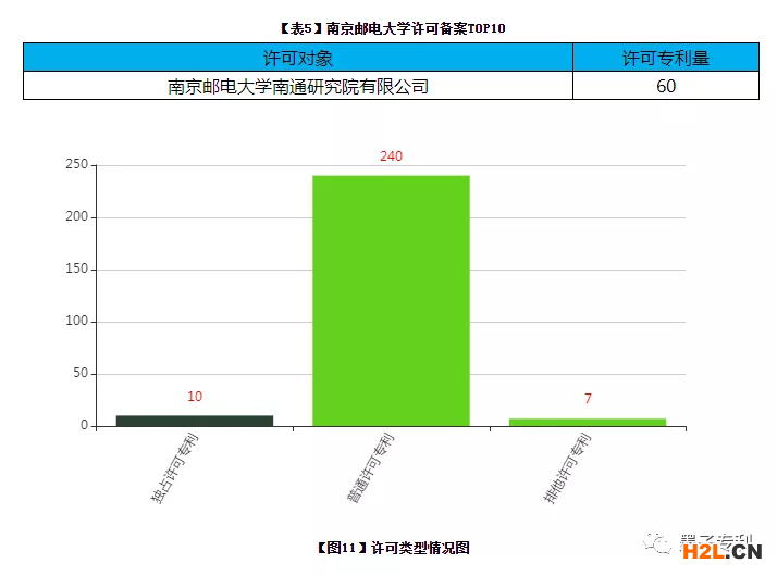 2021年11月全國(guó)高校與科研院所共 257 件專(zhuān)利發(fā)生了 265 次許可備案,其中 10 件專(zhuān)利發(fā)生 10 次獨(dú)占許可備案,240 件專(zhuān)利發(fā)生了 248 次普通許可備案,7 件專(zhuān)利發(fā)生了 7 次排他許可備案,如【圖11】所示;許可人情況如【圖12】,南京郵電大學(xué) 60 件專(zhuān)利發(fā)生許可備案。許可量第一的南京郵電大學(xué)的專(zhuān)利許可備案情況如【表5】所示: