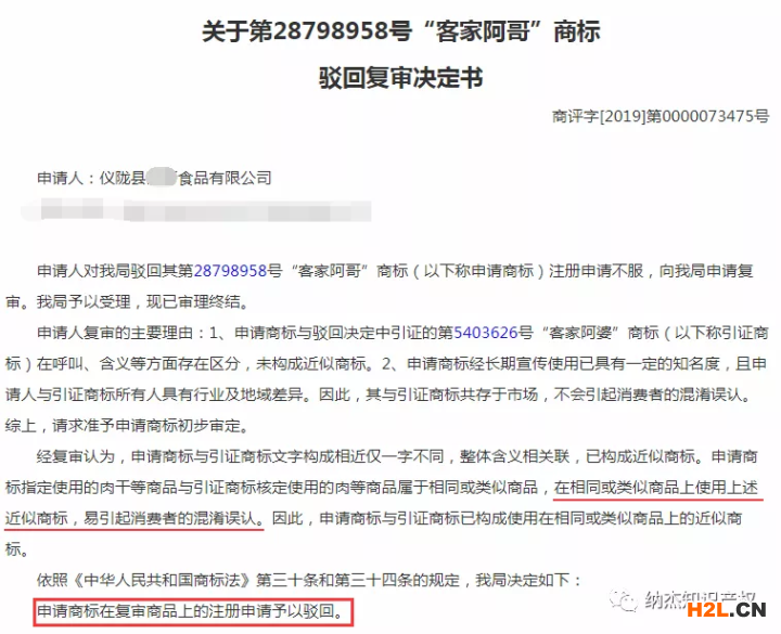 三、國(guó)家知識(shí)產(chǎn)權(quán)局就儀隴縣阿哥食品有限公司針對(duì)第28798958號(hào)“客家阿哥”商標(biāo)提出的駁回復(fù)審申請(qǐng)重新作出決定。
