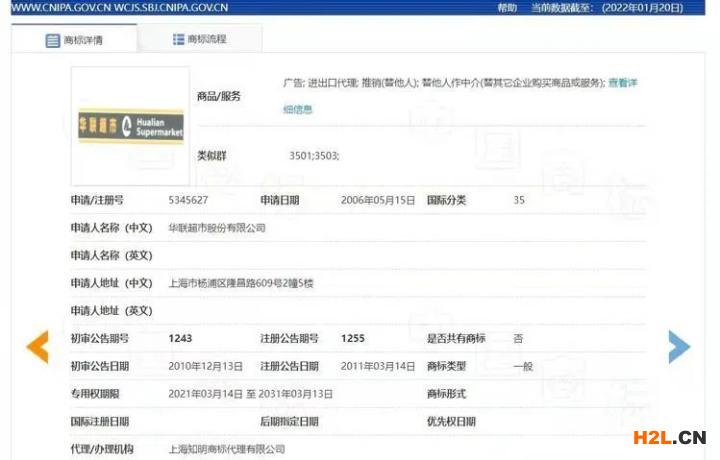 據(jù)國家知識產(chǎn)權(quán)局商標(biāo)局、中國商標(biāo)網(wǎng)顯示,該公司于2006年、2007年分別申請注冊了兩個35類“華聯(lián)超市”相關(guān)商標(biāo),其核定服務(wù)項目包括:推銷(替他人)、替他人作中介(替其它企業(yè)購買商品或服務(wù))、開發(fā)票、廣告等。