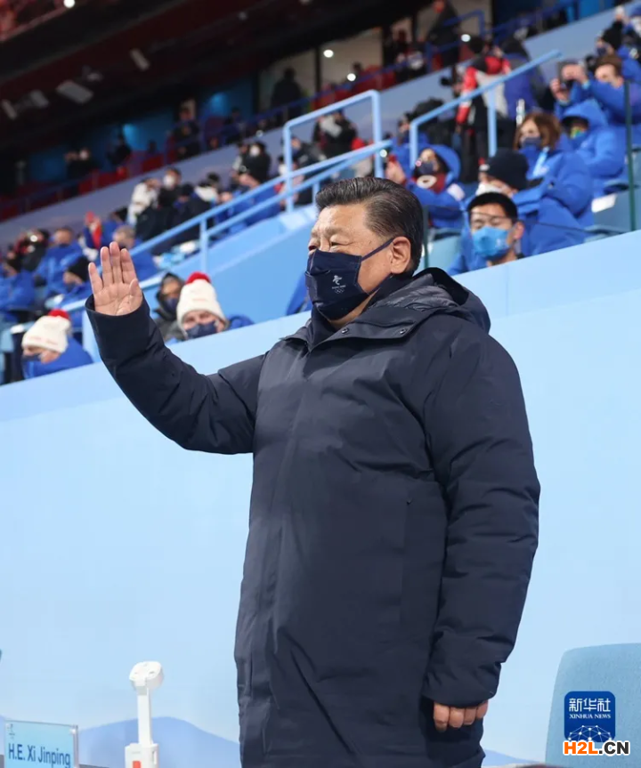 播音員向觀眾介紹中國(guó)國(guó)家主席習(xí)近平、國(guó)際奧委會(huì)主席巴赫,習(xí)近平和巴赫起身向大家揮手致意,全場(chǎng)再次響起熱烈掌聲。
