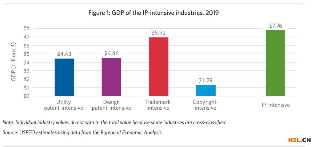 2019年,該報(bào)告涵蓋的127個(gè)知識產(chǎn)權(quán)密集型行業(yè)創(chuàng)造了美國21.43萬億美元GDP總額中的7.8萬億。其中,商標(biāo)密集型行業(yè)占近7.0萬億美元,實(shí)用專利密集型和外觀設(shè)計(jì)專利密集型行業(yè)各占近4.5萬億美元,版權(quán)密集型產(chǎn)業(yè)總計(jì)略少于1.3萬億美元。該報(bào)告還指出,由于一些行業(yè)是交叉分類的,因此各知識產(chǎn)權(quán)類型的總和實(shí)際超過了7.8萬億美元。