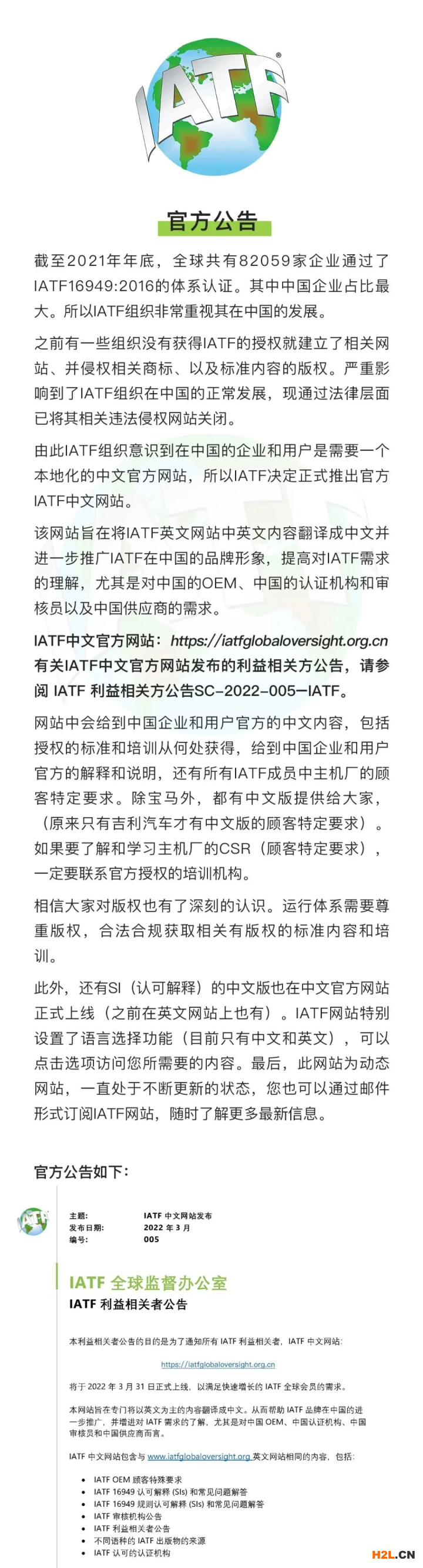 3月31日,IATF 推出了IATF中文網(wǎng)站,并且在IATF數(shù)據(jù)庫中推出了IATF 績效投訴管理系統(tǒng)(IATF CMS)。
