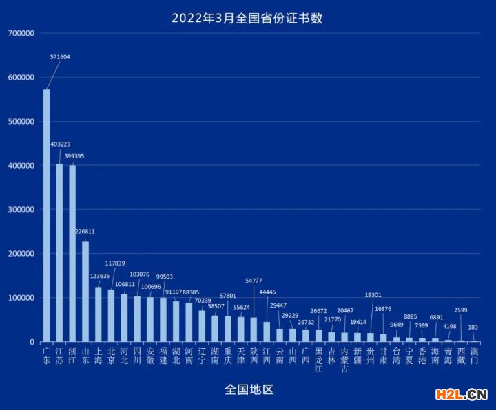 2022年3月全國各省份認(rèn)證證書數(shù)量統(tǒng)計