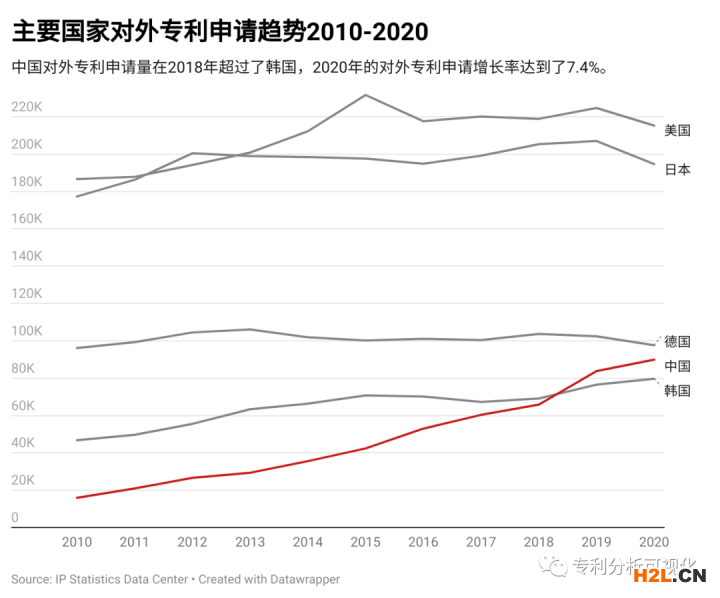 從主要國(guó)家對(duì)外專利申請(qǐng)趨勢(shì)來看,美國(guó)和日本遙遙領(lǐng)先,中國(guó)和德國(guó)、韓國(guó)組成了第二梯隊(duì)。從對(duì)外專利申請(qǐng)總量來看,美國(guó)從2014年之后每年一直穩(wěn)定在20萬件以上,日本也在20萬件上下徘徊。中國(guó)從2010年的接近2萬件發(fā)展到2020年的接近10萬件,發(fā)展速度還是很快的,2018年首次超過韓國(guó),2020年的對(duì)外專利申請(qǐng)?jiān)鲩L(zhǎng)率更是達(dá)到了7.4%,跑贏了我國(guó)GDP的增速。