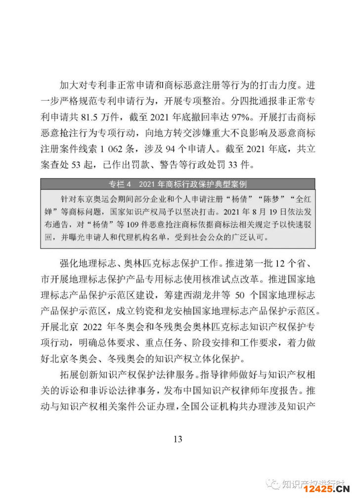 加大對專利非正常申請和商標惡意注冊等行為的打擊力度。進一步嚴格規(guī)范專利申請行為,開展專項整治。分四批通報非正常專利申請共81.5萬件,截止2021年底撤回率達97%。開展打擊商標惡意搶注行為專項行動,向地方轉交涉嫌重大不良影響及惡意商標注冊案件線索1062條,涉及94個申請人。截至2021年底,共立案查處53起,已作出罰款、警告等行政處罰33件。